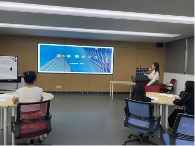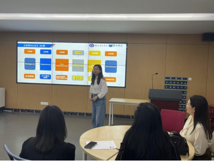 接下来喻珍老师结合自己的授课内容进行了说课分享,喻老师的课程设计由以下六部分组成:回顾上节课内容;阐述教学目标;指出教学重难点;参与式学习课程内容(实习礼仪、面试礼仪);内容小结;情景模拟。