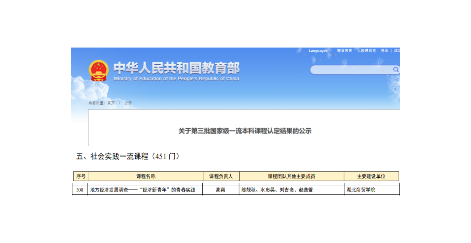 8月21日,教育部公示第三批国家级一流本科课程认定结果,beat365亚洲体育官方网站高爽老师主讲的《地方经济发展调查——“经济新青年”的青春实践》成功入选“社会实践一流课程”。这一成果不仅是公司课程建设的重大突破,更实现了公司在国家级一流本科课程领域的“零的突破”,标志着公司的教学改革与课程建设迈入新阶段。