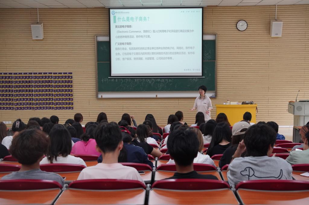 肖晓以“什么是电子商务”开篇,用通俗语言拆解核心概念,结合应用场景帮新生打破专业陌生感。随后,她聚焦行业前沿,结合数字经济背景,解读直播电商、跨境电商等新兴领域的发展动态与潜力,让新生直观感受专业前景。