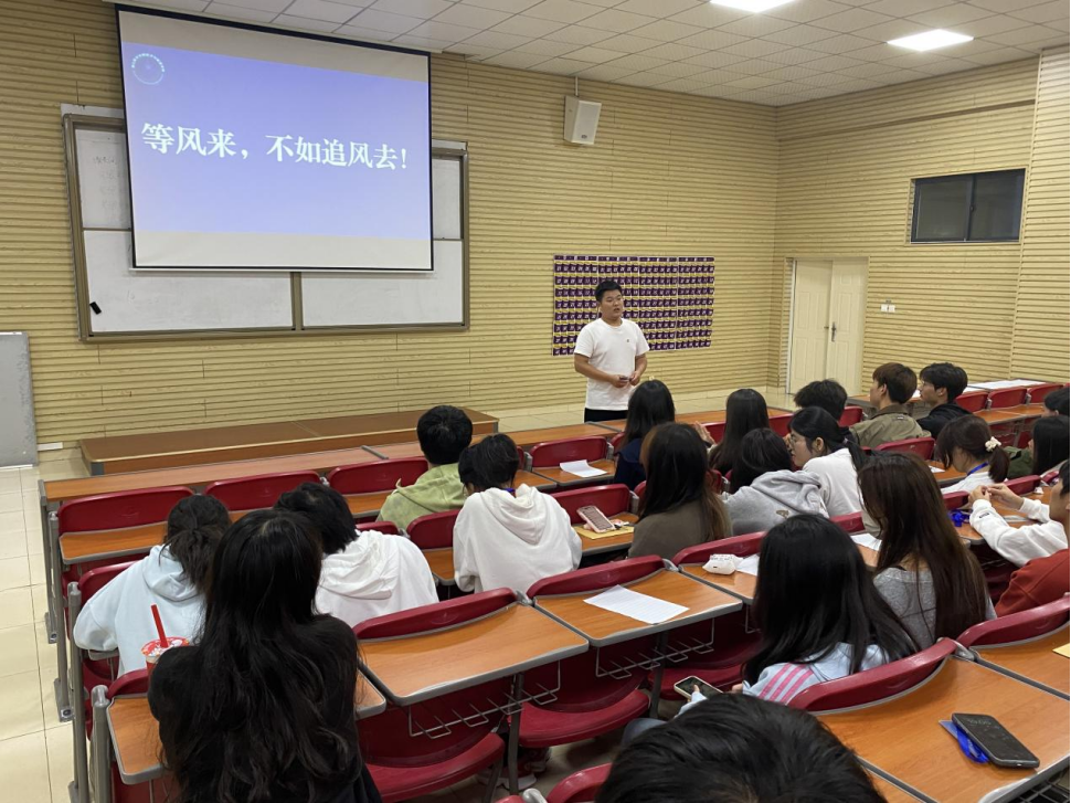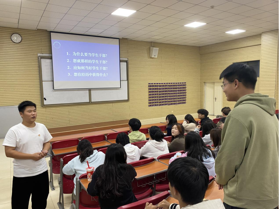 接着由王开涛发言,他先是提出了4个问题:1、为什么要当员工干部?;2、想要成为什么样的员工干部?;3、应如何当好员工干部?;4、想在经历中获得什么?。现场同学们踊跃回答着这几个问题,提出了自己的想法。紧接着王开涛老师谈到了初心,“不忘初心,方得始终”,时刻保持初心,继续前进。随后对员工到员工干部“从群众来,到群众中去!”“从员工中来,到员工中去”展开了讲解。还讲到了习近平总书记致全国青联十三届全委会和全国学联二十七大的贺信中的一句话“我国广大青年要坚定理想信念,培育高尚品格,练就过硬本领,勇于创新创造,矢志艰苦奋斗,同亿万人民一道,在矢志奋斗中谱写新时代的青春之歌”。最后寄予了全体同学“等风来,不如追风去!”的期望!