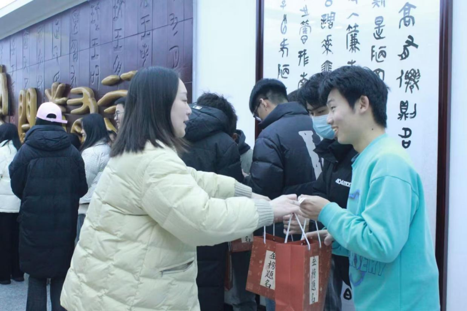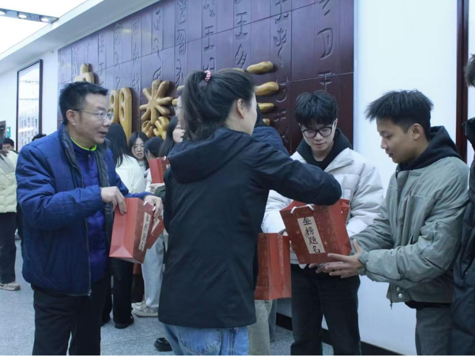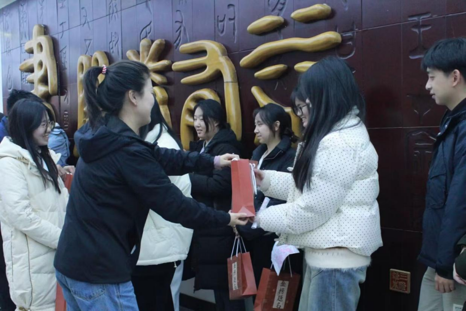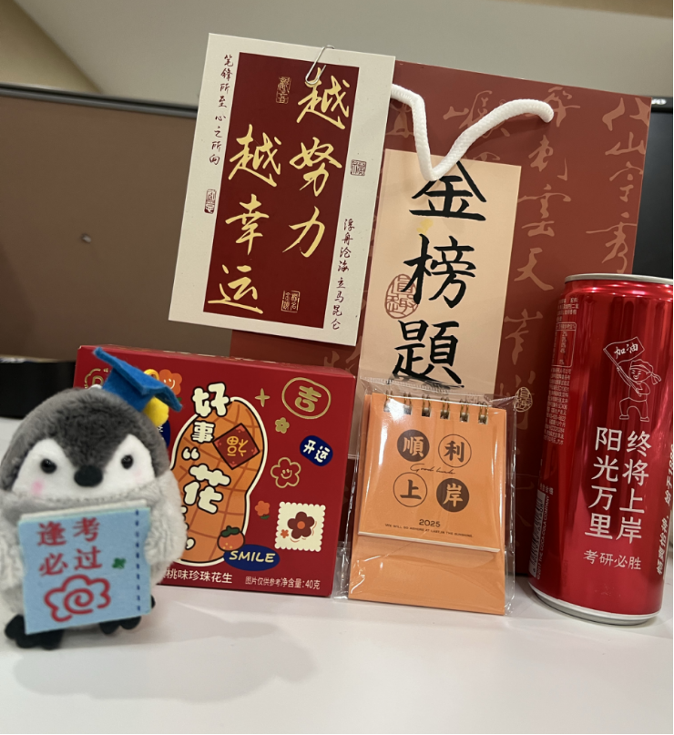 随后,老师们为考研学子送上了精心准备的考研慰问礼包。礼包中包含了好事“花”生、逢考必过小公仔、“阳光万里,中将上岸”可乐等寓意美好的物品,每一份心意的背后都蕴含着老师们的关心与支持。