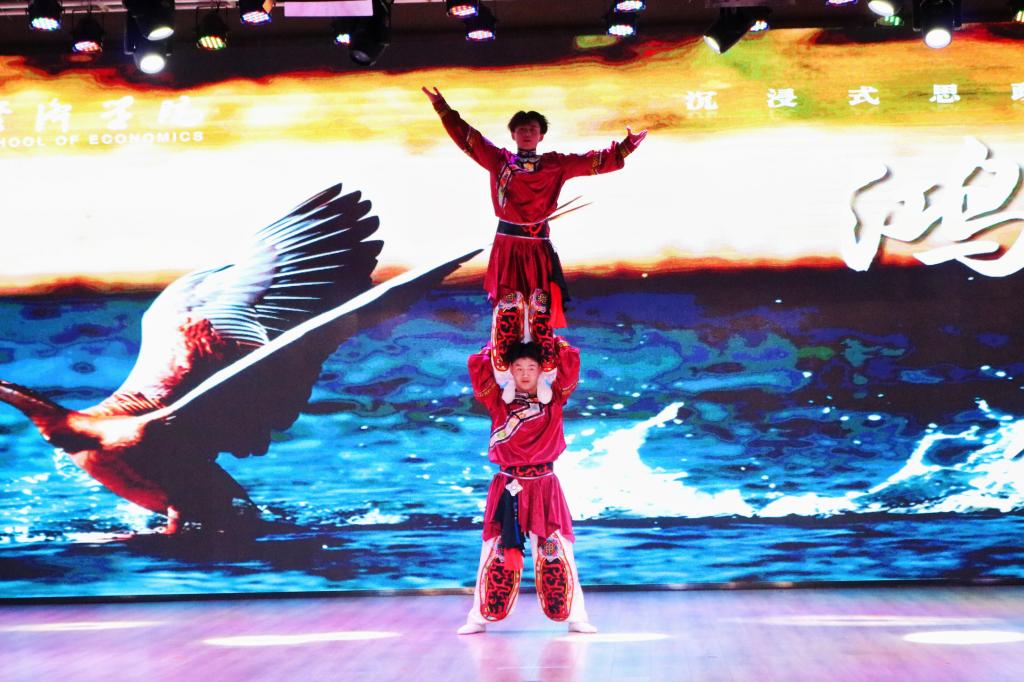 在第二篇章“青春·狂想”中,2023级金融本二班雷童同学以钢琴独奏《克罗地亚狂想曲》将观众带入了音乐世界,仿佛让观众看到一个年轻人在阳光下奔跑,勇敢追梦。来自咸宁校区的李云炜和刘帅杰同学演绎的民族舞《鸿雁》,充满了对传统文化的敬仰和热爱,将力量感、韵律美和情感表达完美结合。