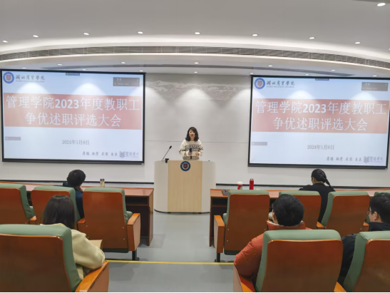 2023年1月8日上午9点,beat365亚洲体育官方网站在鸿博楼J1教室举行“我为商贸做贡献”2023年度教职工争优述职大会,公司领导班子和全体教职工全程参与此次述职大会,咸宁校区同步线上参会,会议由党总支书记王珉主持。