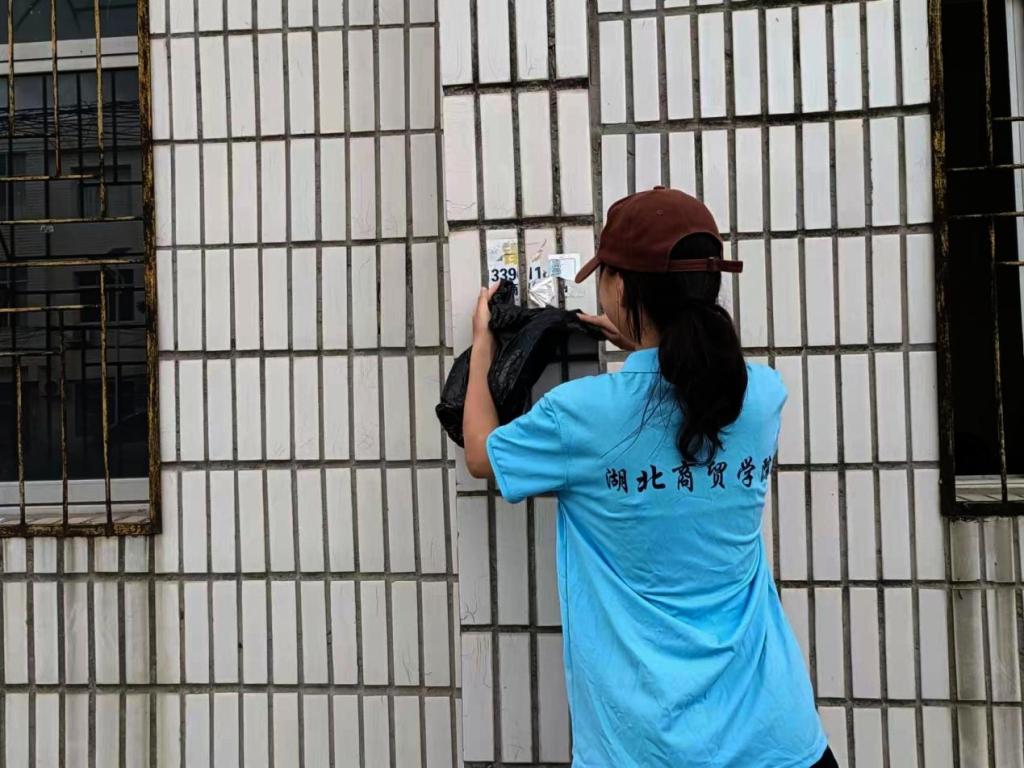 活动当天,团队成员们在襄阳市长虹社区一栋广场进行集合,每个人领取铲子、垃圾袋、洗洁精等工具后前往小广告可能出现的地方,团队成员之间相互配合,分工明确。