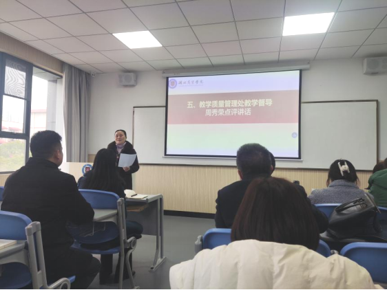 在各位新老教师分享展示完毕,教学质量管理处专家周秀荣教授对本次磨课研讨活动中各位老师的表现进行总结点评。首先,周教授对初次站上讲台的新教师表示了肯定,指出初次站上讲台的新教师不怯场、有激情,对待教学事业认真负责、教学环节完整,看到了各位教师独具特色的教学风格。同时,周秀荣专家鼓励青年教师向磨课中具备丰富授课经验的老教师学习,鼓励新教师在授课中应加强师生互动、以多样化的方式进行课程导入、适当板书、授课内容层层递进等,并指出磨课教师的教学资料存在的不足并给予有效的改进建议。最后,她相信新教师在经历不断的磨课研讨、相互听课、相互学习中定能更好的站稳讲台,提升教学水平。