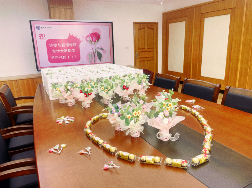 活动现场温馨而热烈,充满了节日氛围。桌上各色花朵精致绽放,巧克力、糖果琳琅满目,色彩鲜艳。经过充分调研,精心构思,公司为每位老师准备了实用的手工编织花和巧克力作为节日礼品。