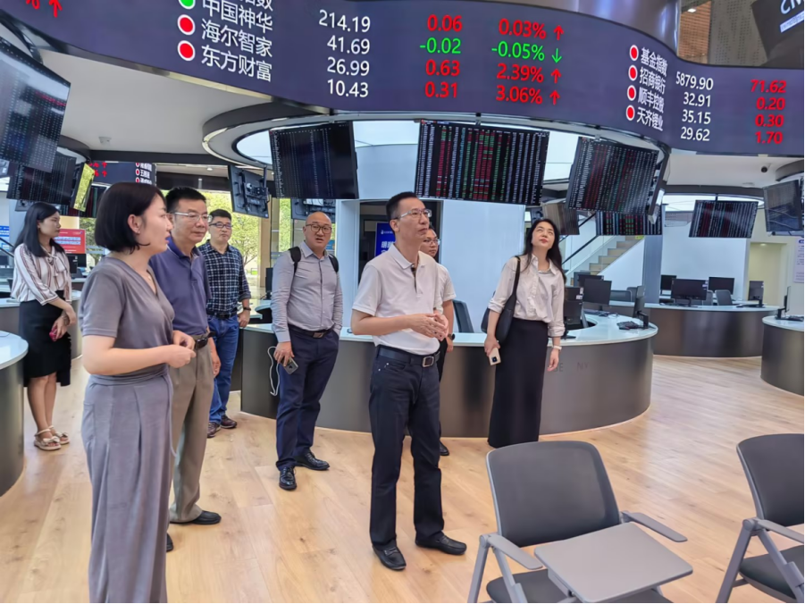 7月11日下午,湖北证券期货业协会秘书长李翎、湖南期货业协会刘丹岳、长江证券投教专员王凯一行来公司进行交流,并参观公司新金融智慧学习工场。公司经理严良、副经理孟静、陈红兵、金融教研室徐若瑜和张盼参加本次交流。