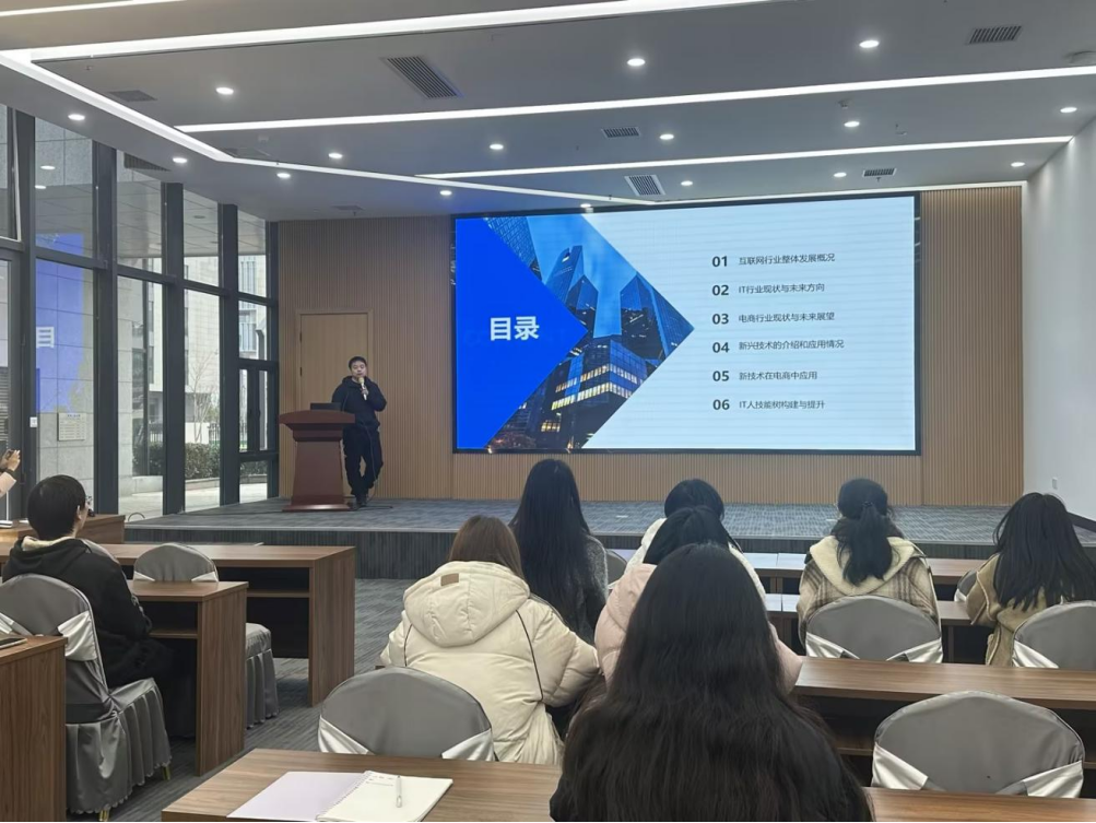 12月29日,公司师生一行前往位于武汉市江夏区创谷二路的中软国际教育科技集团华中总部。企业导师赵燕、汤磊分别做“探索IT行业方向与电商未来趋势”、“数智技术引领电商行业”及“智能商务发展趋势”三个主题讲座。赵燕指出中国具备巨大的消费潜力和消费空间,电子商务对消费的促进作用依然明显,网络零售体现了消费市场的热点和趋势。同时,电子商务用户圈层不断扩大,为稳定就业作出重要贡献。随着中国电子商务蓬勃发展,新业态新模式不断涌现。汤磊指出即时零售、直播电商、跨境电商、农村电商以及“AI+电商”等为中国电子商务发展注入新活力。数智化技术的广泛深入应用正在塑造着在线消费与服务的全新面貌,并驱动服务消费进入一个快速增长的新发展阶段。
