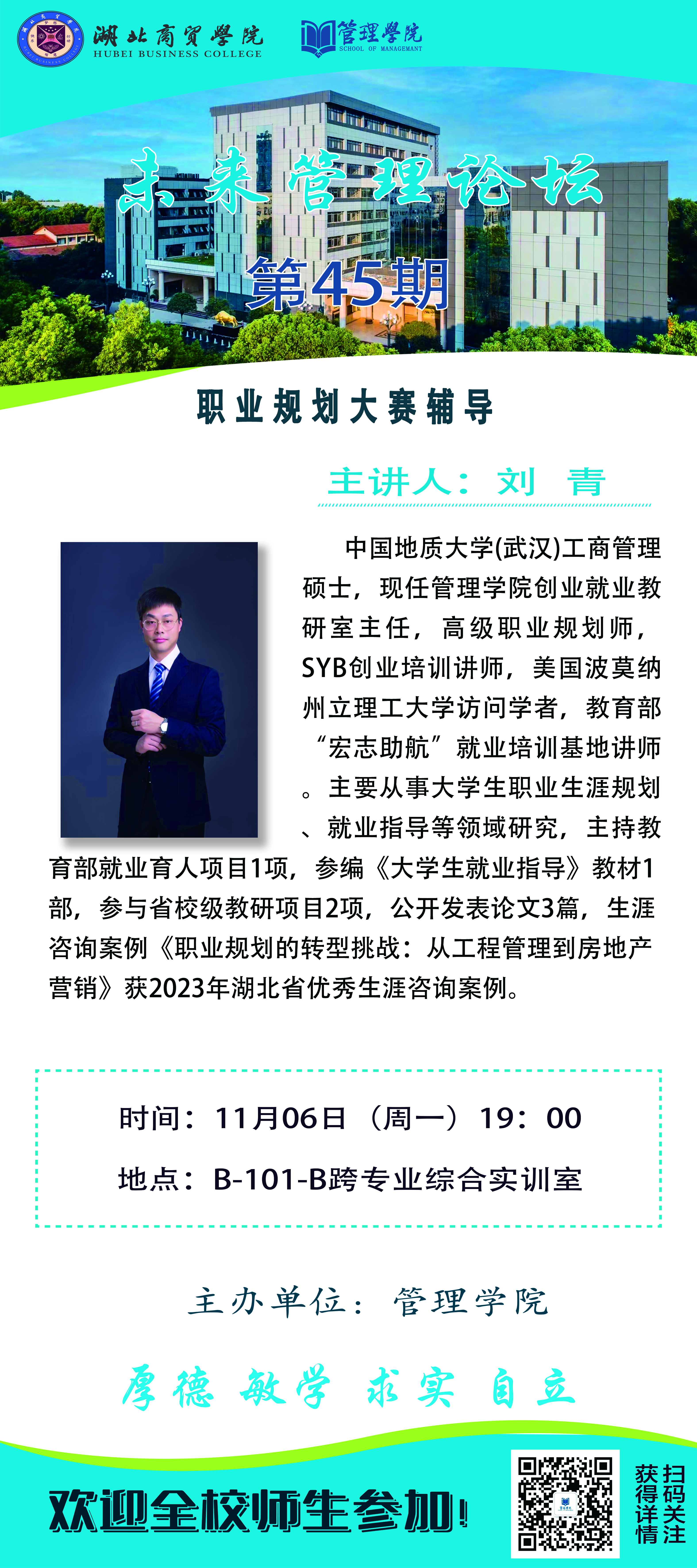 本期论坛邀请beat365亚洲体育官方网站创业就业教研室主任,高级职业规划师,SYB创业培训讲师刘青主题是:职业规划大赛辅导欢迎全校师生于11月6日(周一)下午19点00分做客B-101-B跨专业综合实训室