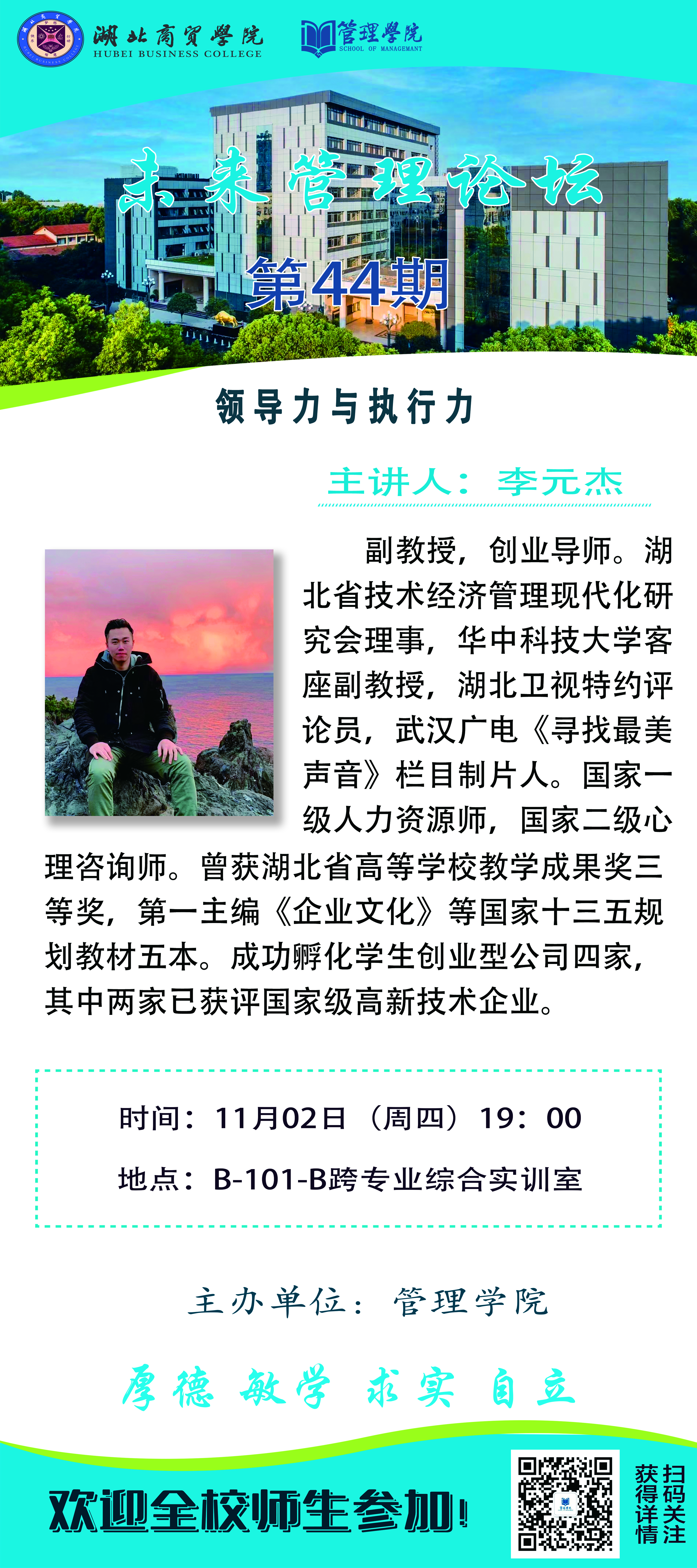 本期论坛邀请beat365亚洲体育官方网站副教授、创业导师李元杰主题是:领导力与执行力欢迎全校师生于11月2日(周四)下午19点00分做客B-101-B跨专业综合实训室