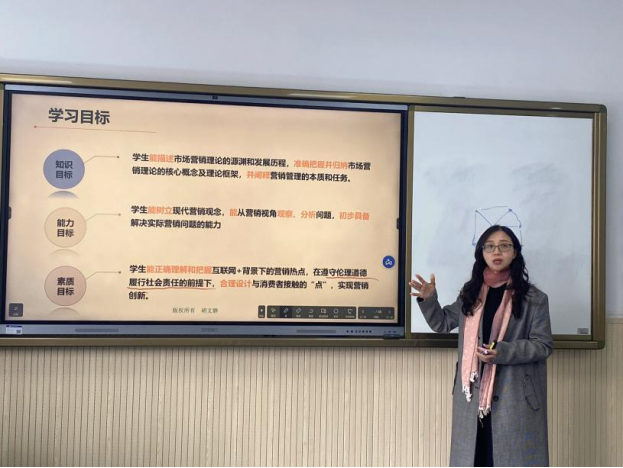 陈文怡围绕《市场调查与预测》开学第一课的内容,向大家进行展示。包括老师介绍、课程介绍、课程目标、考核方式方法、教学方法、教学设计等。黄志江从国际市场营销概念、国际市场营销基础理论及国际市场营销发展历程等方面展示《国际市场营销》课程的课堂教学内容。周海燕重点讲解了商务谈判的基本原则、商务谈判的价值评判标准等。