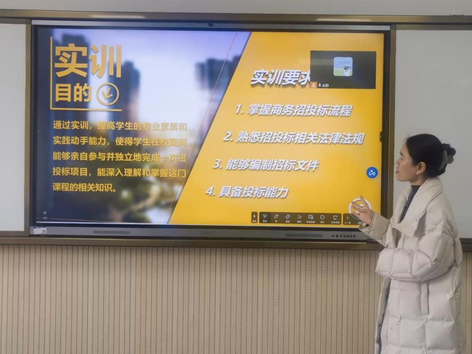 教研室主任赵静用说课的形式展示《商务招投标实训》这门课程的教学流程和教学内容,该课程通过模拟招投标过程中的各个环节,使得员工能够全面参与并独立地完成一次招投标项目,深入理解和掌握招投标的相关知识,提高员工的专业素质和实践动手能力。