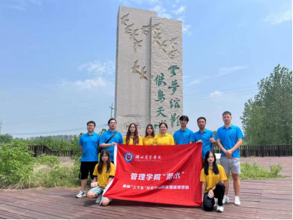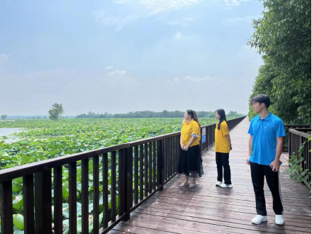 次日,团队在出发前往潜江的紫月湖公园进行水资源保护的科普宣传。途中团队来到了潜江的湿地保护区,其中水资源的保护也是重要的一环。在这里大家看到了映照蓝天白云而清水荡漾的湖泊,还有红染并蒂的荷花身旁拥簇着片片好似裙摆的荷叶,芦苇飘荡随风起舞翩翩,无不展现着保护区的生机盎然,风中的清香亦是让我们在夏日感到瞬间的清爽。