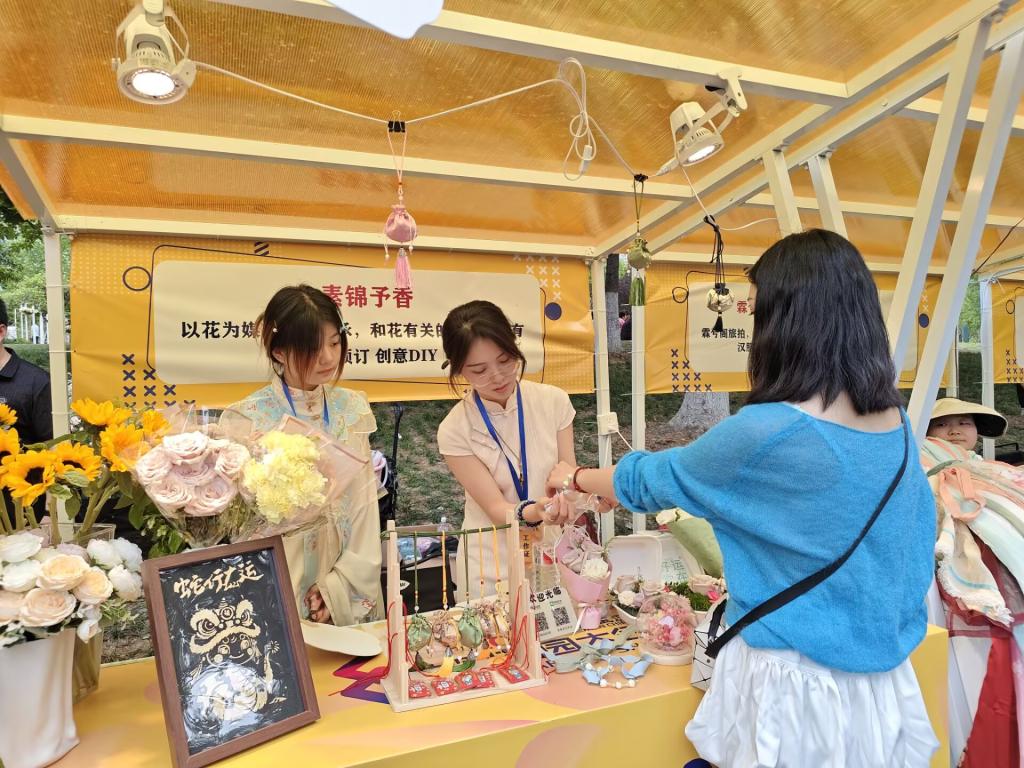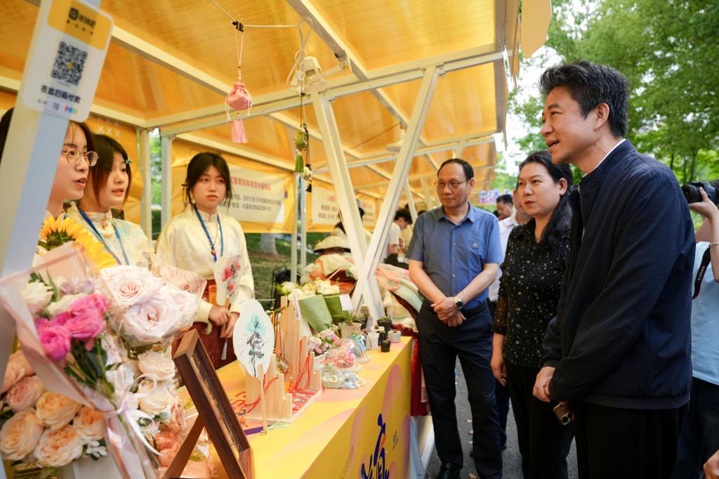 在绿意盎然的市集现场,beat365老员工创业团队巧妙融合传统工艺与现代设计理念,推出永生花艺术摆件、非遗团扇手绘、微型生态花植等系列产品,吸引众多市民驻足选购。团队负责人彭爽现场演示永生花制作工艺,讲解团扇纹样中的荆楚文化元素,充分展现跨学科创新能力。省委统战部副部长王济民仔细询问项目运营模式,对“传统技艺+环保理念+数字营销”的创新路径表示认可,并选购员工设计的楚风团扇作为文创纪念品。省中华职教社副主任熊汉华特别关注项目与专业教育的衔接,称赞其“将课堂知识转化为市场价值,是职业教育改革实践的优秀案例”。